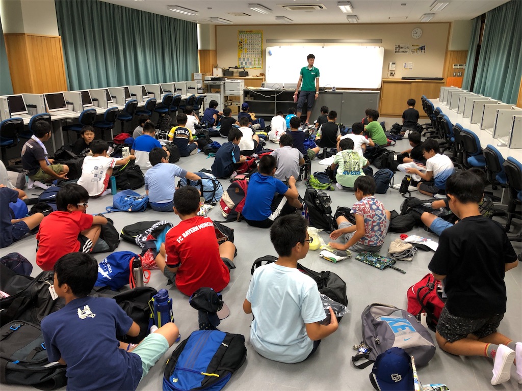 2019-07-29 林間学習 前日 この地方もいよいよ梅雨明けとなり、今日も夏真っ盛り。5年生は明日からの林間学習に向け、事前出校日です。体育館は暑いため、空調のきく部屋で荷物点検や健康チェックなどを行いました。